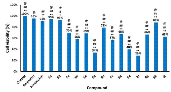 Anti-proliferative effect of the tested compounds on the viability of HT-29 cells. Columns are mean of cell viability percent after treatment with compounds 5a–d, 8a–i, ibuprofen and ketoprofen at 5 μM for 72 h ± SD (n = 6). MTT cell viability assay experiment was conducted three times. p-value determined by two-tailed unpaired t-test. * indicates significant difference versus control at p < 0.01 (**). # indicates significant difference versus Ibuprofen at p < 0.05 (#), p < 0.01 (##). @ indicates significant difference versus Ketoprofen at p < 0.05 (@), p < 0.01 (@@).