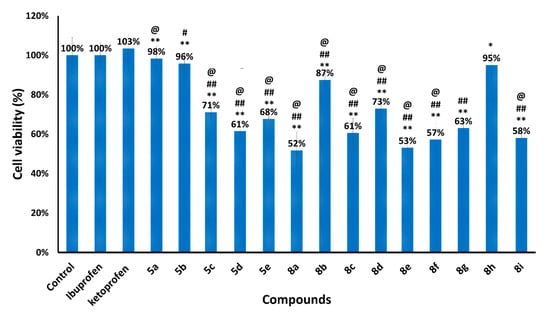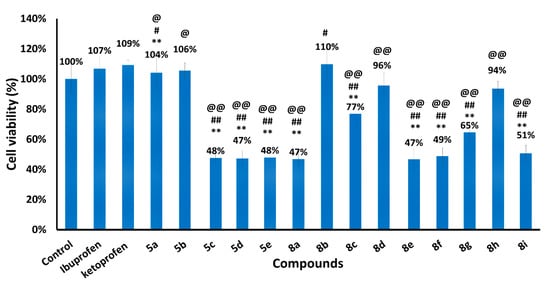 Anti-proliferative effect of the tested compounds on the viability of A549 cells. Columns are mean of cell viability percent after treatment with compounds 5a–d, 8a–i, ibuprofen and ketoprofen at 5 μM for 72 h ± SD (n = 6). MTT cell viability assay experiment was conducted three times. p-value determined by two-tailed unpaired t-test. * indicates significant difference versus control at p < 0.05 (*), p < 0.01 (**). # indicates significant difference versus Ibuprofen at p < 0.05 (#), p < 0.01 (##). @ indicates significant difference versus Ketoprofen at p < 0.01 (@).