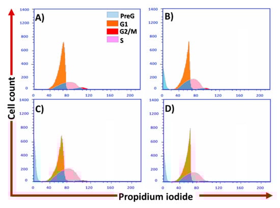 Flow cytometry histograms showing the effect of compound 8a,e,f (5 μM) on cell cycle distribution of MCF-7 cells after 48 h treatment with (A) control; (B) 8a; (C) 8e; (D) 8f, (n = 3). Experiment was repeated 3×.