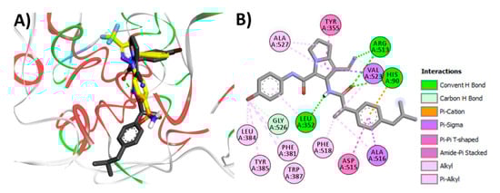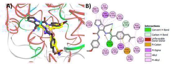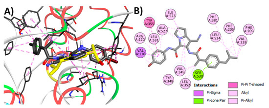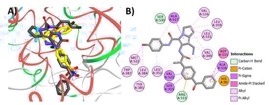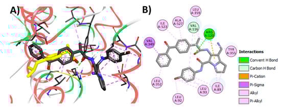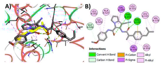 Binding modes/interactions of best-fitting conformation of 8a (shown as stick, colored by element) into the active site of COX-2 (pdb code: 1CX2): (A) 3D binding mode of 8a superposed with SC588 (yellow stacks); (B) 2D binding mode of 8a into COX-2 showing different types of binding interactions, hydrogen atoms were omitted for clarity, the figure generated using Discovery Studio Visualizer (V16.1.0.15350).