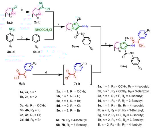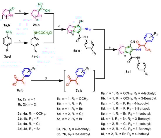 The synthesis of the target hybrids 8a–i is presented in Scheme 1. Compounds 2a,b were obtained from the reaction of 1a,b with malononitrile according to the previous reports [34,35]. In addition, compounds 4a–d were prepared from the reaction of chloroacetyl chloride with the appropriate aniline derivatives 3a–d [34,35]. On the other hand, the pyrrolizine/indolizine derivatives 5a–e were prepared from the reaction of 2a,b with the appropriate acetanilide derivatives 4a–d [36].