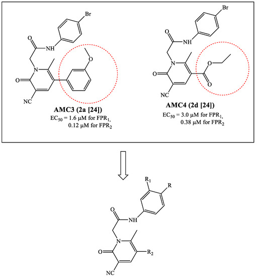 Over the years, we reported numerous compounds with various scaffolds and different potency/selectivity towards the three FPR isoforms [17,18,19,20,21,22,23,24,25]. Our latest research involved the study of pyridinone derivatives, which showed some selectivity towards FPR2 [24]. The most interesting compound AMC3 (2a in the original paper) (Figure 2) was evaluated in vivo in a rat model of rheumatoid arthritis and was able to completely control pain hypersensitivity at a dose of 30 mg/kg/day. A common requirement for all previously published active compounds was the presence of the substituted phenyl acetamide fragment (bromine was the best substituent) and a methoxyphenyl ring linked to the heterocyclic scaffold. Surprisingly, when the methoxyphenyl ring at position 5 in the series of pyridinone derivatives was replaced with an ethoxy carbonyl group as in compound AMC4 (2d in the original paper [24]) (Figure 2), the activity and FPR2 selectivity were preserved.