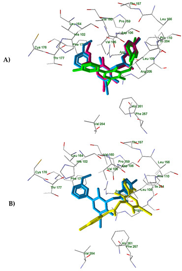 The superimposed docking poses of compounds AMC3 (light-blue) [25], AMC4 (magenta), and 14a (light-green) (Panel A); AMC3 (light-blue) [25] and 14c (yellow) (Panel B) in the FPR2 binding site (PDB entry 6OMM). Residues within 4Å from AMC3 pose are visible.
