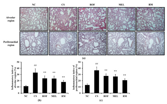 Histological examination of the lung tissue revealed extensive inflammatory infiltration into the lung tissue of mice from the CS group (Figure 2). By contrast, ROF and MEL treatments decreased the pulmonary inflammation induced by exposure to CS. In addition, reduction in pulmonary inflammation was reduced to a greater extent in the RM group than in the ROF or MEL groups.