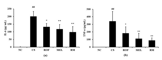 IL-6 levels in BALF were higher in samples from the CS group than the NC group (Figure 3a). In contrast, ROF and MEL groups showed significantly decreased levels of IL-6 in BALF, compared to the CS group. The reduction in IL-6 levels was the most noticeable in the RM group. Similar to the IL-6 levels, the TNF-α levels in BALF were higher in the CS group than in the NC group (Figure 3b). However, the ROF, MEL, and RM groups showed significantly lower TNF-α levels in BALF than the CS group, with the most remarkable decrease in the RM group.