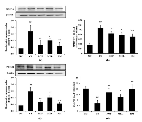Mice in the CS group showed marked elevation in MMP-9 expression in lung tissues compared to mice from the NC group (Figure 4a). In contrast, the ROF, MEL, and RM groups showed a significant decrease in MMP-9 expression, with the RM group showing the most noticeable reduction. Further, the MMP-9 level was markedly increased in BALF in the CS group compared to the NC group (Figure 4b). However, ROF and MEL groups showed significantly lower MMP-9 level than the CS group. This reduction was more remarkable in the RM group. Consistently, PDE4B expression was markedly increased in the CS group compared to the NC group; however, the ROF and MEL groups showed significantly decreased PDE4B expression, compared to the CS group (Figure 4c). PDE4B expression was reduced to a much greater extent in the RM group than in the ROF or MEL groups. The cAMP level in BALF was markedly decreased in the CS group, compared to the NC group; however, it was significantly increased in ROF, MEL, and RM groups compared to the CS group (Figure 4d), with the RM group showing the greatest degree of elevation.
