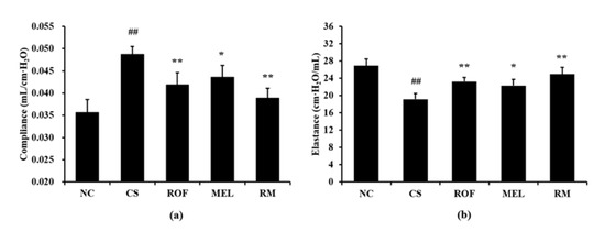 The CS group showed markedly increased lung compliance than the NC group (Figure 5a). However, compared to the CS group, the ROF and MEL groups exhibited significant reduction in lung compliance. In particular, lung compliance was reduced to a greater extent in the RM group than in the ROF or MEL group. The CS group showed a significant reduction in elastance compared to the NC group (Figure 5b). In contrast, the ROF, MEL, and RM groups exhibited a marked elevation of elastance compared to the CS group, with the RM group showing the greatest degree of elevation.