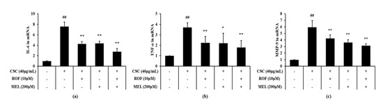 Expression levels of IL-6 and TNF-α were significantly increased in CSC-stimulated cells compared to non-treated cells (Figure 6a,b, respectively). However, melatonin treatment significantly decreased the IL-6 and TNF-α expression levels in CSC-stimulated cells. Roflumilast treatment also yielded similar results. Furthermore, roflumilast and melatonin cotreatment decreased the IL-6 and TNF-α expression levels to a greater extent than roflumilast or melatonin treatment alone. Consistently, MMP-9 expression was higher in CSC-stimulated cells than in the non-treated cells (Figure 6c). By contrast, melatonin treatment significantly reduced MMP-9 expression, compared with CSC-stimulated cells. Similar results were obtained with roflumilast treatment. Moreover, this reduction was more enhanced in roflumilast and melatonin cotreated cells.