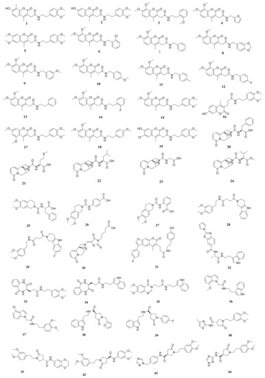 - Sánchez-Recillas, A.; Navarrete-Vázquez, G.; Hidalgo-Figueroa, S.; Rios, M.Y.; Ibarra-Barajas, M.; Estrada-Soto, S. Semisynthesis, ex vivo evaluation, and SAR studies of coumarin derivatives as potential antiasthmatic drugs. Eur. J. Med. Chem. 2014, 77, 400–408. [Google Scholar] [CrossRef] [PubMed]
