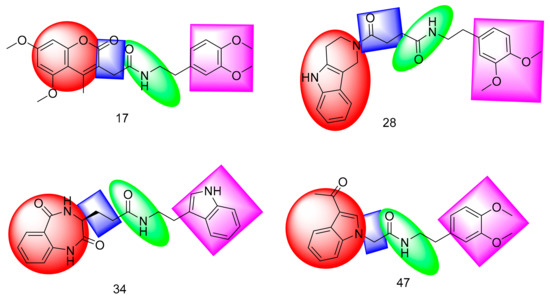 Compounds 34 and 47 showed four red patches, which can form hydrogen bond acceptors. Compound 34 showed three red patches and two blue patches. The aromatic moieties of these compounds showed yellow patches which can form hydrophobic interactions with hydrophobic amino acid residues (Figure 12 and Figure 13).