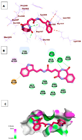 (A) 3D of compound 47 docked into the active site of PLpro. (B) 2D of compound 47 docked into the active site of PLpro. (C) Surface mapping of compound 47 docked into the active site of PLpro.
