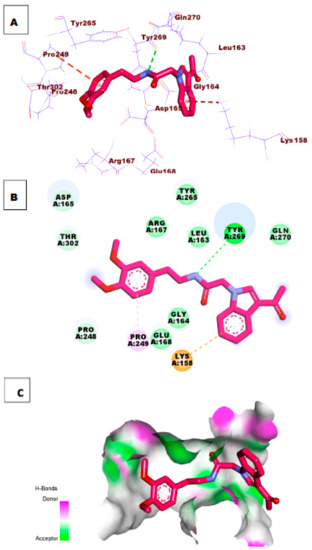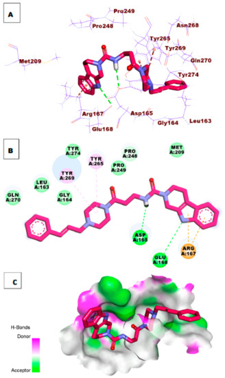 The docking simulation of compound 28 revealed that it has a good fitting into the enzyme active site with a docking score of −8.48 kcal/mol. The oxygen of the carbonyl group formed one hydrogen bond with the essential amino acid Tyr269. Additionally, the NH group of the pyrrole ring formed one hydrogen bond with Ala247. The 2,3,4,5-tetrahydro-1H-pyrido[4,3-b]indole moiety formed Tyr265, Asp165, and Pro248 (Figure 6).
