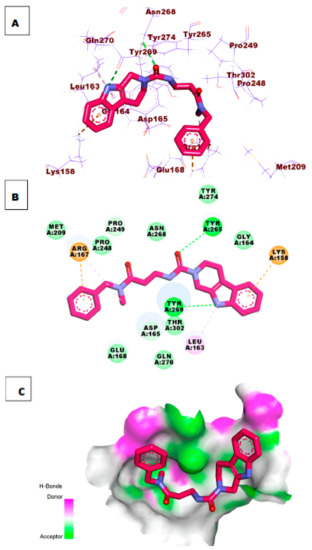 The proposed binding mode of the redocked ligand S88 revealed an affinity value of −8.59 kcal/mol. This high binding affinity is probably attributed to the formation of two hydrogen-bonding interactions. One was formed between the N-H group of the amide moiety and Tyr269 while the other was formed between the nitrogen atom of the pyridine ring and Asp165. Additionally, the naphthyl moiety formed four hydrophobic interactions with Tyr269 and Pro249. These results were found to be consistent with the reported data [45] (Figure 5).