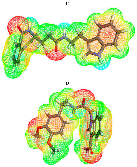 MEP displays the electronegative atoms (negative values) in red. Electronegative atoms act as hydrogen bonding acceptors. On the other hand, it displays electron-poor atoms (positive value) in blue. Electron-poor atoms act as hydrogen bonding donors. It displays the neutral atoms (zero values) in a green to yellow color. Neutral atoms can form π- and other types of hydrophobic interactions. Such information facilitates the prediction of the chemical reaction and the binding mode with the biological target [70].