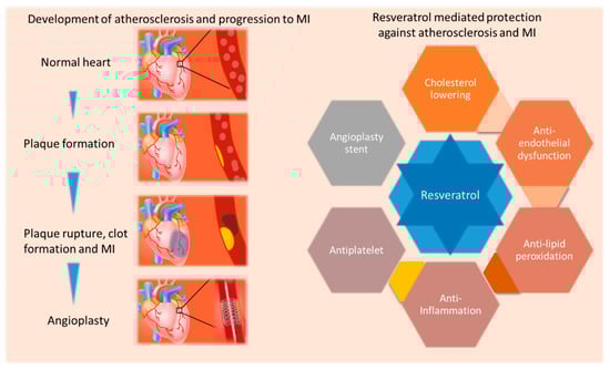 Angioplasty with drug eluting stents is a preferred treatment for stenosis and occlusions in coronary arteries associated with MI. However, there are unavoidable drawbacks with this therapy as well. Interestingly, a rodent study mimicking arterial angioplasty and stenting with resveratrol-eluting stents tested the effects resveratrol on neointimal hyperplasia and re-endothelialization [71]. The delivery of resveratrol from a drug-eluting stent reduced in-stent stenosis, while promoting re-endothelialization [71]. This may be helpful in lowering the risk of late-thrombosis seen with drug-eluting stents. Another study investigated the effects of angioplasty with resveratrol-coated balloon catheters in coronary and peripheral arteries [72]. A reduction in the number of microvessels and macrophages in the adventitia and improvement in re-endothelialization were also happened in peripheral arteries with treatment [72]. In addition, paclitaxel/resveratrol-coated balloon catheter was tested for the transport of the coating and subsequent beneficial effects [73]. Specifically, inhibition of neointimal proliferation, inflammation and tolerance of complete coating and resveratrol-only coating was investigated in pigs for four weeks after treatment [73]. In peripheral arteries with resveratrol-only balloons, inflammation and fibrin deposition were lower along with a reduction in macrophage and a pronounced re-endothelialization [73]. Harmful complications were not noticed with high-dose treatment of coronary arteries [73]. In adult male New Zealand White rabbits, intravascular administration of resveratrol by drug-delivery catheter after the induction of intimal hyperplasia by traumatic angioplasty resulted in an inhibition of intimal proliferation [74].