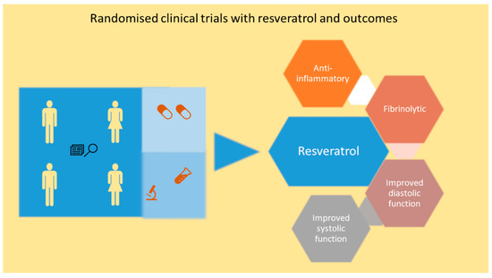 Due to the evidence from a large number of pre-clinical studies, a great level of enthusiasm exists for exploring the cardioprotective role of resveratrol in patients with ischemic heart disease and HF. In this section, evidence from clinical trials will be analyzed (Table 3 and Figure 3). To date, pure resveratrol and resveratrol-enriched grape extract have been used in clinical trials suggesting diverse avenues of clinical strategies which can be pursued with resveratrol.