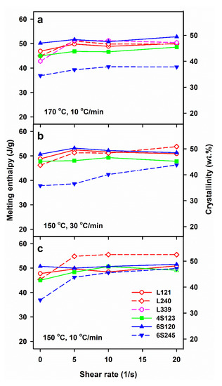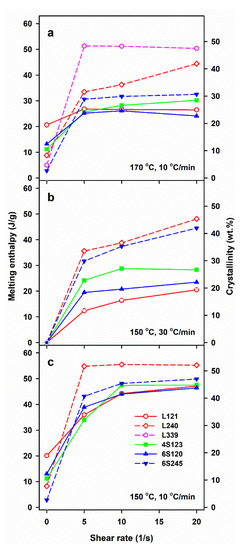 Melting enthalpy, ΔHmc, of crystalline phase formed in PLLAs during cooling at 10 and 30 °C/min after shearing at 170°C (a) and 150 °C (b,c) versus shear rate,.