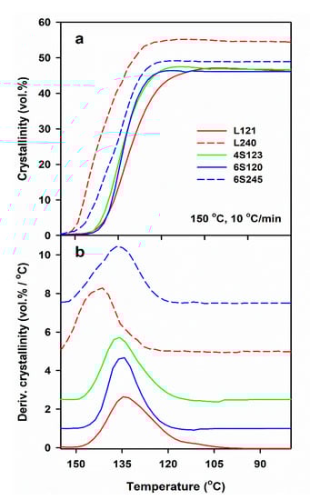 Development of crystallinity determined by light depolarization method (a) and derivative of crystallinity with respect to temperature (b) in PLLAs during cooling at 10 °C/min after shearing at 20/s, 150 °C. The curves in Figure 3b shifted vertically for clarity.