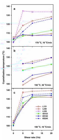Crystallization peak temperature, Tc, during cooling of PLLAs at 10 and 30 °C/min after shearing at 170 °C (a) and 150 °C (b,c) versus shear rate, .