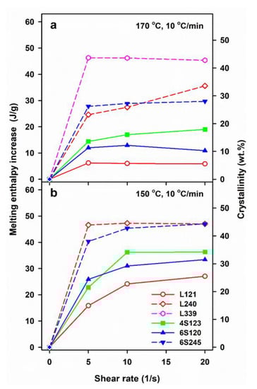 Increase of melting enthalpy, ΔHmc-ΔHmcq, of crystalline phase formed in PLLAs during cooling at 10 °C/min caused by shearing at 170 °C (a) and 150 °C (b) versus shear rate, . ΔHmcq denotes the melting enthalpy of crystals formed during cooling at 10 °C/min in control specimens.