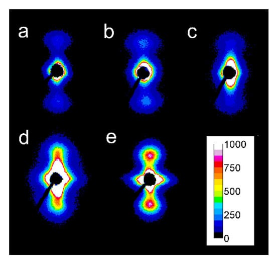 2D-SAXS patterns of PLLAs: sheared at 150 °C at 20/s for 5 s and cooled at 10 °C/min: L121 (a), 4S123 (b), 6S120 (c), L240 (d), 6S245 (e). Shearing direction–vertical.