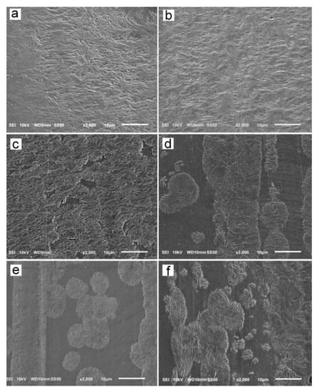 The reason for the orientation of crystals was the shear-induced formation of fibrillar nuclei aligned in the shearing direction on which grew lamella stacks perpendicular to the shearing direction. This is well seen in SEM micrographs of cross-section surfaces of sheared PLLAs, presented in Figure 10. The micrograph of L339 sheared at 170 °C at 20/s and next cooled at 10 °C/min, in Figure 9a, evidences the presence of lamellar stacks perpendicular or nearly perpendicular to the shearing direction, and lamella fans developed from the stacks. The stacks form cylindrical structures suggestive of nucleation on fibrillar nuclei. Similar morphology was found in L240 sheared at 150 °C at 20/s, and next cooled at 30 °C/min, as shown in Figure 10b, although spherulites between cylindrical structures were also discernible. Figure 10c presents 6S245 sheared at the same conditions and cooled at the same rate. In the micrograph, cylindrical structures are seen accompanied by spherulites, with radii of several micrometers. Amorphous areas are visible in few places between the spherulites, where crystallization was not accomplished. In L121, 6S120 and 4S123 sheared at 150 °C at 20/s crystallization during cooling at 30 °C/min was even less advanced, as shown in Figure 10d–f. The cylindrical structures and spherulites between them are well distinguishable, the latter more numerous than in PLLAs with higher Mw. The effect of slower cooling on PLLAs sheared at 150 °C at 20/s is illustrated in Figure 11. The morphology of L240 and 6S245 cooled at 10 °C/min was similar to that observed after faster cooing, as exemplified in Figure 11a showing L240. In PLLAs with Mw close to 120 kg/mol amorphous areas were not visible any longer because of high χc reached in these polymers during slower cooling. The specimens were completely filled with cylindrical structures and spherulites between them, as seen in Figure 11b showing L121.