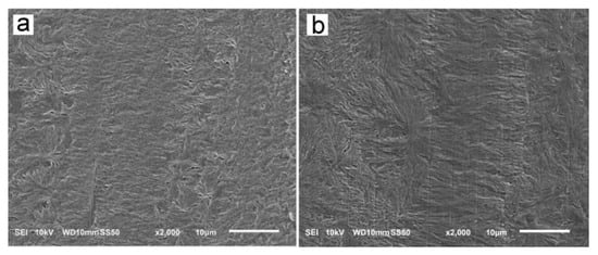 To reveal their internal structure, selected sheared PLLA specimens were cut across their thickness parallel to the shearing direction, and the exposed surfaces were analyzed with scanning electron microscopy (SEM) using Jeol JSM-5500 LV (Tokyo, Japan). Before the examination, the specimens were etched according to the known method [36,43], at 37 °C, in a solution of 61 mg of Trizma base, 2 mg of sodium azide and 4 mg of Proteinase K (all from Sigma-Aldrich, St. Louis, MO, USA) in 5 mL of distilled water. After appropriate washing and drying, the specimens were sputtered with gold.