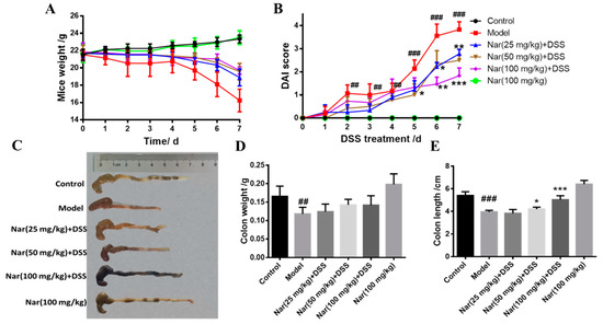 Naringin could alleviate the symptoms of DSS-induced colitis in mice. (A) Changes in body weight of mice during the experiment. (B) DAI score. (C) Appearances of the colon tissues. (D) Weights of colon in different groups. (E) Lengths of colon in different groups. Data are presented as means ± SD (n = 10 per group). ## p < 0.01 and ### p < 0.001, compared with the control group; * p < 0.05, ** p < 0.01 and *** p < 0.001, compared with the model group.