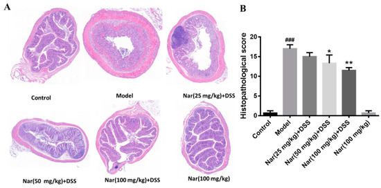 Inflammatory changes in colitis are limited to the large intestine and are commonly characterized by crypt distortion and goblet cell loss. Histopathological results showed that the control mice had a large number of goblet cells and an intact mucus layer, while those goblet cells and mucus layer in the DSS group were seriously destroyed with extensive infiltration of inflammatory cells (Figure 2A). Such an opened mucus layer might directly contact intestinal pathogenic microorganisms and further accelerate the damage of the mucus layer and inflammatory response in colitis. As expected, the phenomenon was obviously improved by the treatment of naringin, which could reduce the colon injury and restore the integrity of the colon structure. Histopathological scores of each group also demonstrated that naringin intervention could considerably improve morphological structure of colon tissue at medium (p < 0.05) and high (p < 0.01) doses of naringin therapy. Only the Nar (100 mg/kg) group did not cause colitis symptoms, including DAI scores, colon shortening and histopathological changes. Both DAI score and histological analysis showed that naringin had a significant alleviation effect on colitis.