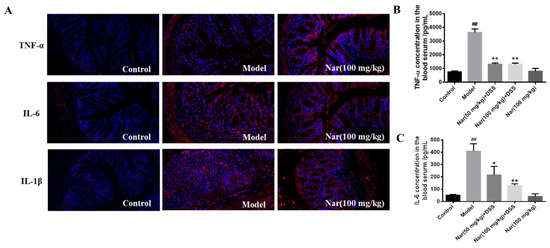 Overproduction of pro-inflammatory cytokines is considered as the major factor in the occurrence and development of UC. The complex interaction between infiltration of inflammatory cells and release of inflammatory cytokines could exacerbate the intestinal inflammation [32,33]. Naringin was reported to have potential anti-inflammatory activity [34]. Based on these, the reduction of inflammatory cytokines at colon tissue level and serum level were fully evaluated in Figure 3. Tumor necrosis factor-α (TNF-α), interleukin-6 (IL-6) and interleukin-1β (IL-1β) in mouse colon tissue were detected by immunofluorescence (Figure 3A). The results showed that the secretion of all three factors was significantly increased in the DSS group, and the colon morphology was also damaged. But after naringin treatment, the level of those cytokines decreased and the colonic morphology recovered to some extent. Simultaneously, the contents of TNF-α and IL-6 in mice serum (Figure 3B,C) also dramatically decreased after medium (p < 0.05) and high (p < 0.01) doses of naringin therapy in comparison with those of the model group through enzyme-linked immunosorbent assay (ELISA). These results suggest that the naringin could reduce inflammation and decrease intestinal permeability.