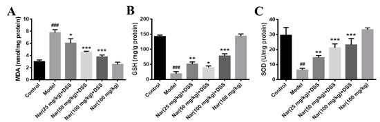 It is well-known that disruption of the mucosal immune barrier causes the accumulation of reactive oxygen species (ROS), resulting in the induction of UC [35,36]. Mohamed, E. A et al. reported that naringin has an antiulcer effect and can regulate the level of oxidative stress. [37]. To further understand whether naringin treatment has an antioxidant effect on DSS-induced UC, three indicators related to oxidative stress were examined in Figure 4. The results show that malonaldehyde (MDA) contents were significantly increased in the DSS-treated group (p < 0.001), generally accompanied by the decrease of glutathione (GSH) (p < 0.001) and superoxide dismutase (SOD) (p < 0.01) levels. By contrast, MDA contents decreased (p < 0.05 for 25 mg/kg, p < 0.001 for 50 and 100 mg/kg) while GSH (p < 0.01 for 25 mg/kg, p < 0.05 for 50 mg/kg and p < 0.001 for 100 mg/kg) and SOD (p < 0.01 for 25 mg/kg, p < 0.001 for 50 and 100 mg/kg) contents increased after treatment with naringin in a dose-dependent manner. The contents of the three indexes in the Nar (100 mg/kg) group were similar to those in the control group. These results suggested that naringin could effectively improve the oxidative stress of colon segments.