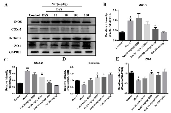An increasing number of studies suggest that the occurrence of intestinal inflammation impairs the integrity of the intestinal epithelial barrier and destroys the dynamic balance of intestinal microbiota [38]. The previous H&E result in our study displayed pathological changes in the colon tissue of DSS-induced colitis, which may also impair the epithelial TJ proteins. In this regard, the expression of proteins involved in inflammation and the intestinal barrier was further investigated through western blotting in Figure 5. The results showed a significant increase in the protein expression of both inducible nitric-oxide synthase (iNOS, p < 0.05) and cyclooxygenase-2 (COX-2, p < 0.001) in the model group. However, the up-regulations of iNOS (p < 0.05) and COX-2 (p < 0.001) were almost suppressed by the naringin treatment at the concentration of 100 mg/kg, which was consistent with the results of inflammatory cytokines expression in vivo. Concurrently, the contents of the TJ proteins ZO-1 and occludin in colon tissue was significantly reduced in the DSS group (p < 0.05), while the expression of those two proteins increased after naringin intervention (p < 0.05 for 50 mg/kg), suggesting the protective effect of naringin on the intestinal tract.