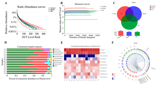Naringin regulated on the disturbed gut microbiota in DSS-induced colitis mice. (A) Rank-Abundance curves of the OUT level. (B) Shannon dilution curves. (C) Venn diagram of species in the three groups. (D) Histogram of intestinal microbial community structure at the phylum level. (E) Community heatmap analysis in the phylum levels. (F) Circos of samples and species in the phylum levels.
