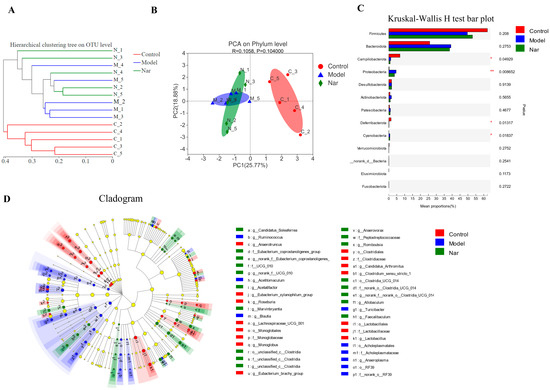 Sample comparative analysis enables better comparison of the colony structures of different samples. According to hierarchical clustering analysis of the beta diversity distance matrix, the sample hierarchical clustering tree was constructed. It was found that the control group had a good clustering situation, but the colony was significantly different from that of the model group and Nar group, indicating that DSS could affect the intestinal flora of mice (Figure 7A). Principal component analysis (PCA) in Figure 7B showed that PCA points in the control group and model group were well separated, suggesting the significant differences between these two groups. However, the Nar group was close to the control group, indicating that naringin intervention could improve and adjust the structure of intestinal flora. Additionally, non-metric multidimensional scaling (NMDS) analysis can be used to simplify the research objects of multidimensional space to low-dimensional space for positioning, analysis and classification, which is applicable when exact similarity or dissimilarity data between research objects cannot be obtained. The results of NMDS analysis showed that the distance operation of all values in the control group was similar except for a few discrete values, but the distance between DSS group and Nar group was significant (Figure S1C). Moreover, principal co-ordinates (PCoA) analysis can also be utilized to study the similarity or difference of sample community composition. It can be observed from Figure S1D that the model group differed greatly from the control group, but approached the control group after naringin administration.