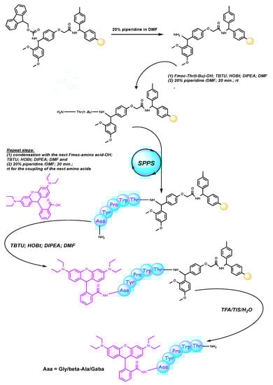 Hemorphins are endogenous peptides, belonging to the family of atypical opioid peptides, released during the sequential cleavage of hemoglobin proteins [13,14,15]. Hemorphins have been shown to exhibit diverse therapeutic effects in both human and animal models [16,17,18]. Hemorphin-4 (Tyr-Pro-Trp-Thr) is a member of the hemorphins family, an endogenous nonclassical opioid peptides derived from hemoglobin. There is evidence that these kinds of natural or synthetic tetrapeptides exert opioid activities in vivo and, therefore, may play an important physiological role [19]. Our previously investigations have demonstrated that not only the position of modification, but also the nature of the incorporated group, lead to significant changes in the peptide activity and affinity [20,21,22,23,24,25]. Recently, the rhodamine B-labelled arginine-rich peptide has been designed as the heparin bioreceptor to construct a highly sensitive and selective fluorescent biosensor for heparin detection [26]. However, there are no data in the literature concerning rhodamine conjugated hemorphin analogues.