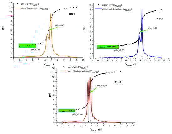 Plot of pH vs. VNaOH and first derivatives graphics of 20 µmoL of Rh-1, Rh-2, and Rh-3, respectively.