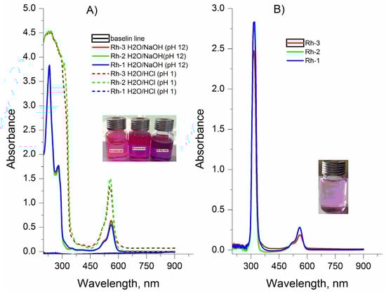 UV-Vis spectrum of Rhodamine derivatives at: (A) equal concentration of the compounds and different pH of solutions. Absorbance of the solution was measured against water; (B) solutions of Rh-1, Rh-2 and Rh-3 in triethylamine with equal concentration of the compounds. Absorbance of the solution was measured against triethylamine.
