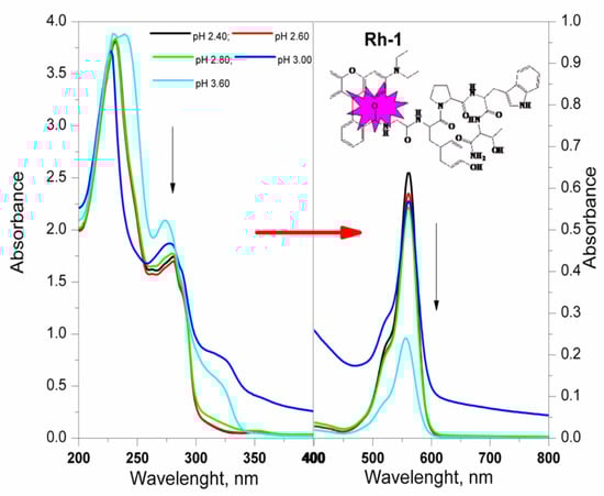 The new compounds were characterized by FT-IR, UV-Vis, and fluorescence spectroscopy in two types of solvents (water (polar protic solvent) and triethylamine (polar aprotic solvent)) in order to investigate changes in the color of the solution directly related to the structure of the compounds. The spectra related to the absorption of electromagnetic radiation of the rhodamine derivatives are given in Figure 4. Two well-formed absorption peaks with different intensity in both used solvents, localized at λmax ≈230, ≈278 nm and 561 nm in the water solutions and λmax ≈ 300 nm and 565 nm of solution of triethylamine, respectively, can be seen (Figure 4). Basically, theπ→π∗ transitions of the > C=O in the peptide bonds is occurred by UV absorption of the peptide molecule in the range 180 to 230 nm. The aromatic side-chains of indole of Trp, phenol rings of Tyr, and rhodamine are primarily responsible for absorption of the π-electron systems of aromatic groups in the range of ≈300 nm [35,36]. The absorption bands occurring at this wavelength are equally intense due to the same number of peptide bonds and the concentration of analyzed solutions. The studied dependence on the pH of the water medium showed that the colors of the aqueous solutions remain unchanged from the strongly acidic medium in which they dissolve to the strongly alkaline one. There is a visible change in the hue of the solutions for the individual compounds, but the difference in the wavelength at which the compounds absorb in the visible region is minimal (2–5 nm). The studied dependence on the pH of the water medium showed that the colors of the aqueous solutions remain unchanged from the strongly acidic medium to the strongly alkaline one. The absorption peak intensity increased three-fold with the decrease of pH values from 12 to 1 (Figure 4 and Figure 5).