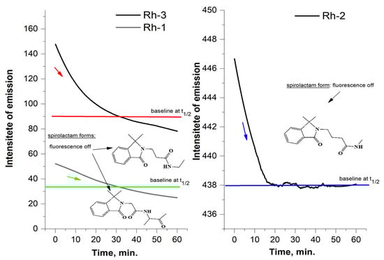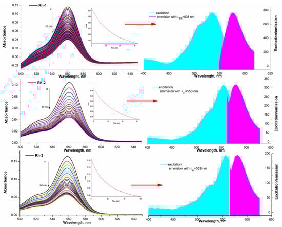 A similar property of rhodamine-related peptides was observed by Meng-Chan Xia et al. [37]. Color stability was observed in the aqueous solutions of the compounds, although the intensity of the absorption maxima depended on the pH of the medium. The molar extinction coefficients in the long-wavelength absorption maximum are, respectively, Rh-3 (ε = 1.83 × 104 cm.mol.L−1); Rh-1 (ε = 2.04 × 104 cm.mol.L−1); and Rh-2 (ε = 2.16 × 104 cm.mol.L−1). The behavior of the compounds in an aprotic solution of triethylamine is different. For about 6–120 min, a visible fading of the solution is observed until the complete disappearance of the color. This is the due to the observed steric effect in the molecules of the compounds associated with the case of spirolactam ring opening. This provoked our interest in studying, in addition, the influence of the environment on the structural changes of the compounds. The effect of the peptide substituent on the ring opening/closing time is clearly visible with studying the kinetics of the process. For this purpose, the spectra of the solution were taken at the initial moment, immediately after its preparation and subsequently on every 5–10 min. Figure 6 shows the decrease in the intensity of the absorption peak. The kinetic lines were taken at the same time interval and by fluorescence (Figure 7). The observed small Stock shift is typical for rhodamine dyes. It is characteristic and of the newly synthesized rhodamine B-conjugated hemorphin-4 analogues. However, the increase in the spacer length between chromophore and peptides leads to a minor enhancement of Stock shift due to the changes in molecule mobility [5,38].