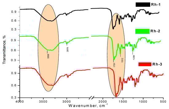 The IR spectrum of studied compounds were recorded in KBr tablet (KBr, cm−1) and shown main characteristic bands, localized at as follow: 3356 (N-H stretching vibration (νNH)), 1701 (s)—NCO (amide) stretching and 1678–1722 cm–1—a high-intensity peak of νC=O; 1511–1528 cm–1 (δNH) (Figure 8). As can be seen, the absorption lines in addition prove the functional groups belonging to the structure of the compounds (Figure 8).