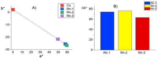 Comparison of the colour coordinates of cotton fabric (Co) and fabrics dyed with Rh-1, Rh-2, and Rh-3: (A) color characterization with a* and b* coordinates; (B) color difference DE*.