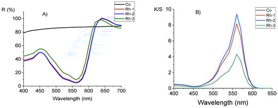 Comparison of cotton fabric (Co) and fabrics dyed with Rh-1, Rh-2, and Rh-3: (A) reflection spectra; (B) K/S values in function of wavelength.