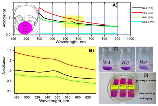 The stability of the textile material after dyeing with the new antiviral agents was also studied. In order to evaluate the rebinding of the compounds when washing the dyed textile material with soap and water, the spectra of the obtained soap solutions were taken following the washing procedure. When washing the materials with water only, no difference in the spectrum of the solutions after soaking the materials was observed (Figure 11). Studies have shown that in all compounds immediately after washing with soap, the color of the fabric is slightly affected and after drying there is a visible fading of the materials (Figure 11). As can be seen from the figure most strongly absorbs the solution of Rh-2 which can be attributed to a lower binding affinity with the textile material and lower resistance to washing in an alkaline environment. However, no difference was observed in the color of the textiles when soaking the materials in the washing solution (water and soap) for 1 and 24 h.