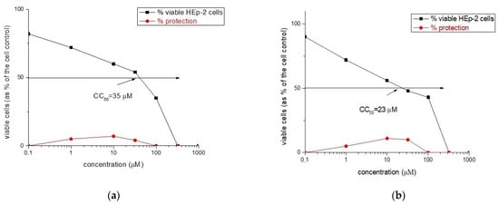 Antiviral activity curve (in red) and cytotoxicity curve (in black) of: (a) Rh-1 and (b) Rh-2.