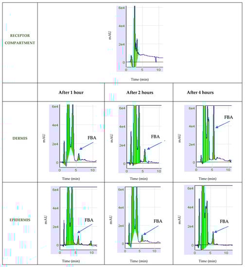A new chromatographic method was used to determine the FBA concentration in the epidermis, dermis, and receptor compartment by time. The results of skin permeation were expressed in µg/mL and reported in Table 1.