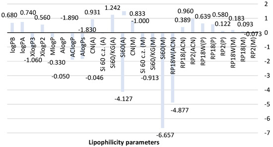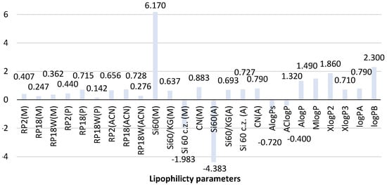 Lipophilicity can be expressed by partition coefficient (P) or more often by its decimal logarithm (logP) of a compound between two phases, namely nonpolar (e.g., n-octanol) and polar (water). Different experimental and theoretical approaches are used for the estimation of the lipophilicity of various classes of compounds [1,2,3,4,5]. The oldest reference method used for the prediction of logP is the shake-flask method that has several limitations. This procedure is time-consuming and requires a large number of solvents and a high purity of the sample. In addition, this method allows the determination of logP in the limited range of −3.0 to +3.0. Recently, in order to overcome these difficulties, the traditional shake-flask method was successfully replaced by alternative methods such as liquid chromatography techniques, namely reversed- and normal-phase thin-layer chromatography (RP-TLC and NP-TLC) as well as reversed-phase high-performance liquid chromatography (RP-HPLC). Chromatographically determined parameters RMW and logkw are powerful lipophilicity descriptors [1]. Numerous studies have been performed in order to determine the lipophilic properties of different bioactive compounds as drugs or new drug candidates, including the new purine-2,6-dione derivatives, newly synthesized celecoxib analogues, thiosemicarbazides, quinolone sulfonamides, benzenesulfonohydrazides, 1,2,3-triazole-dipyridothiazine hybrids, betulin derivatives, selected steroid derivatives, chalcones, and flavonoids, by using liquid chromatographic techniques, including RP-TLC [6,7,8,9,10,11,12,13,14,15,16,17,18,19,20]. Among various chromatographic separation methods, RP-TLC is an easy-to-use and low-cost chromatographic technique. It allows analyzing several compounds simultaneously, and the consumption of organic solvents is low compared to other chromatographic techniques. In addition, the use of high-performance thin-layer chromatographic (HPTLC) plates improves the resolution and the detection sensitivity of studied compounds. The importance of TLC in the estimation of the lipophilicity of different compounds has been described in a few recently published review papers [3,4,5].
