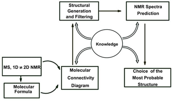 The chemistry of natural products generally deals with large molecules frequently containing 25–100 skeletal atoms, and ACD/SE_v1 was generally destined to fail for the identification of chemicals of this complexity. Based on our previous experiences, and those reported in the literature [22,23,24,25], we extended the system to support multiple types of 2D NMR spectra, specifically 1H-1H, 1H -13C and 1H-15N NMR experiments in combination with a knowledgebase supporting the structure elucidation of larger molecules represented by natural products [26]. Many new features were incorporated into this system to facilitate ACD/SE supporting the structural interpretation of 2D NMR spectra. A simplified flow diagram of ACD/SE_v2 is shown in Figure 2.