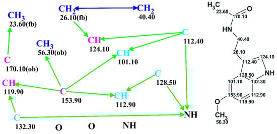 MCD created for the structure shown on the right using data obtained from both HMBC and COSY spectra. Carbon atom hybridization is marked in color as: sp3—blue, sp2—violet, not sp (sp3 or sp2)—light blue. HMBC connectivities are indicated by green arrows and COSY connectivities by blue arrows. The label “fb” near a carbon atom means that bonding with a heteroatom is forbidden, while the label “ob” means that bonding of that given atom to at least one heteroatom is obligatory. The MCD was first introduced ACD/SE_v2 and remains important to present day as a visual cue of NMR correlations.