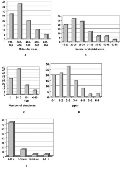 Utilization of the user database can also ease structure, elucidation of compounds belonging to the same family. In this study, a first version of an algorithm employing such fragments in ACD/SE were tested. The methodology of applying FF for structure elucidation will be considered in detail in Section 7 below. However, the results obtained in the process of elucidating the structures of 60 new natural products were generalized in the histograms shown in Figure 5.