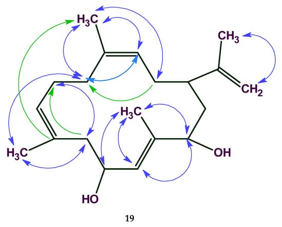 Using the HMQC correlation data next, the directly bonded carbons were associated with their respective protons giving the substructural fragments illustrated by 3–6 (Figure 9).